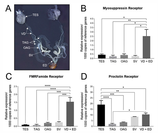 Transcripts for the neuropeptide receptors are expressed in the male reproductive system in R. prolixus. (A) Photograph of the male reproductive system with one testis (TES) de-sheathed to show the follicles, the vas deferens (VD), transparent accessory glands (TAG), opaque accessory gland (OAG), seminal vesicle (SV) and ejaculatory duct (ED). The relative transcript expression of (B) the myosuppressin receptor, (C) the extended FMRFamide receptor and (D) the proctolin receptor in the various structures of the male reproductive system. The y-axes represent the relative expression obtained via geometric averaging using Rp49 and β-actin as the reference genes. The results are shown as the mean ± SEM (n = 4, where n represents a pool of tissue from three insects). The statistical significance of the data was measured using a one-way ANOVA test and Tukey’s post-hoc multiple comparison test. A p value of <0.05 was considered statistically significant and is denoted using asterisks above the bars. * p < 0.05, ** p < 0.01, *** p < 0.001 and **** p < 0.0001.