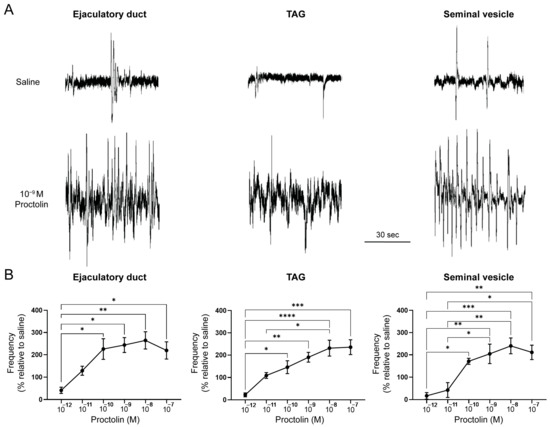 The ejaculatory duct, transparent accessory glands and seminal vesicle display spontaneous contractions, which can be stimulated by proctolin. (A) Spontaneous contractions of the ejaculatory duct, transparent accessory gland (TAG) and seminal vesicle can be simulated by proctolin (10−9 M). Representative traces from six–eight preparations. (B) Proctolin leads to a dose-dependent increase in the frequency of muscle contractions in the ejaculatory duct, the transparent accessory gland (TAG) and the seminal vesicle. The results are shown as the mean ± SEM (n = 4–6). The statistical significance of the data was measured using a one-way ANOVA test and Tukey’s post-hoc multiple comparison test. A p value of <0.05 was considered statistically significant and is denoted using asterisks above the bars. * p < 0.05, ** p < 0.01, *** p < 0.001 and **** p < 0.0001.