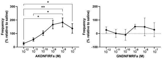 The effects of two extended FMRFamides, AKDNFIRFamide and GNDNFMRFamide, on the contraction frequency of the ejaculatory duct of the male reproductive system. AKDNFIRFamide led to a dose-dependent increase in the frequency of the muscle contractions in the ejaculatory duct, whereas GNDNFMRFamide did not alter the frequency. The results are shown as the mean ± SEM (n = 4–5). The statistical significance of the data was measured using a one-way ANOVA test and Tukey’s post-hoc multiple comparison test. A p value of <0.05 was considered statistically significant and is denoted using asterisks above the bars. * p < 0.05, ** p < 0.01.