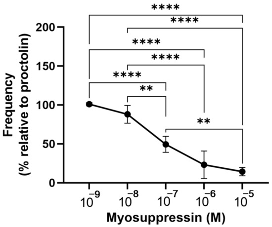 Myosuppressin inhibits a proctolin-induced increase in the frequency of the contractions of the ejaculatory duct in the male reproductive system. Myosuppressin dose-dependently inhibits the increase in the frequency of contractions induced by proctolin (5 × 10−9 M). The results are shown as the mean ± SEM (n = 4). The statistical significance of the data was measured by a one-way ANOVA test and Tukey’s post-hoc multiple comparison test. A p value of <0.05 was considered statistically significant and is denoted using asterisks above the bars. ** p < 0.01 and **** p < 0.0001.
