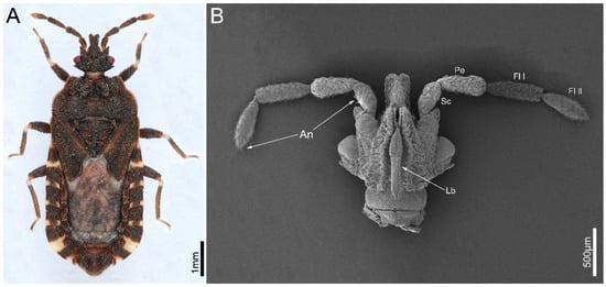 Heteroptera (true bugs) are the most diverse group in the order Hemiptera, which is widely distributed around the world, occupying various types of habitats and exhibiting diverse feeding habits (phytophagy, carnivore, hematophagy, mycetophagy (fungal feeding), and coprophagy) [,,,]. Adaptive changes in feeding-related morphology have been hypothesized to be a key driver of species diversification in this group []. During their evolutionary history, the antennae and mouthparts of Heteropteran species have modified extensively to serve their unique functions [,,,,]. The various types of sensory structures distributed on the antennae of true bugs form a sensilla system, which is the center for receiving signals, including the chemical stimuli during long-distance orientation, and mechanical stimuli in contact with the surface of hosts and mates. Thus, the antennae play an important role in the host-recognition, mating, oviposition, defense, and other behaviors during the life history of true bugs [,,,]. The labial tip, which contacts the host surface during the host selection and feeding process, is usually covered with numerous sensilla functioning as chemoreceptors or mechanoreceptors [,,,,,]. The labium houses the stylet fascicle, which penetrates the food tissue during feeding. The morphology of the stylets adapted to the specialized food sources largely varies among species with different feeding habits [,].