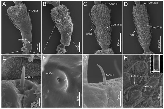 Photographs and SEMs were observed and measured after being imported into Adobe Photoshop 2021 (Adobe Systems, San Jose, CA, USA). The sensilla were classified according to their external morphology, distribution, and position. For classification of sensilla, the systems of Altner and Loftus [] were used in addition to the more specialized nomenclature from other studies [,,].