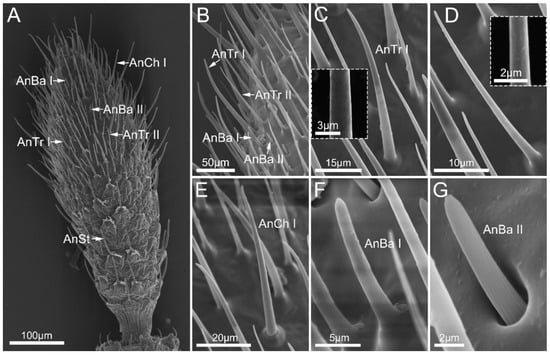 The second segment of flagellum of Mezira yunnana. (A) View of the second segment of flagellum; (B) enlarged view showing the distribution of the sensilla on the second segment of flagellum. (C) antennal sensilla trichodea I (AnTr I), with porous wall shown in the box; (D) antennal sensilla trichodea II (AnTr II), with porous wall shown in the box; (E) antennal sensilla chaetica I (AnCh I); (F) antennal sensilla basiconica I (AnBa I); (G) antennal sensilla basiconica II (AnBa II).