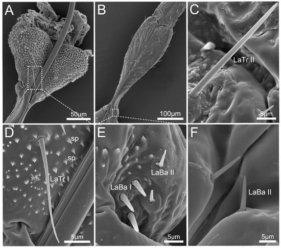Labium of Mezira yunnana. (A) View of the first labial segment; (B) view of the second and third labial segments; (C) labial sensilla trichodea II (LaTr II); (D) labial sensilla trichodea I (LaTr I) and small spine-shaped projections (sp); (E) labial sensilla basiconica I (LaBa I) and labial sensilla basiconica II (LaBa II); (F) LaBa II near the junction.