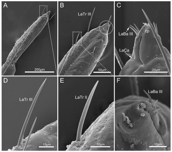 The labial tip is cleft and distinctly divided into two asymmetrical lateral lobes, and the left lobe is slightly wrapped around the right on the ventral surface (Figure 6C,F). Three pairs of labial sensilla basiconica III (LaBa III) encircle the labial tip, which is slightly curved (Figure 6C,F). Several labial sensilla campaniformia (LaCa) are located on the surface near the LaBa III, each of which is leaf-shaped (Figure 6C). Small comb-shaped cuticular processes (cp) densely encircle the opening (Figure 6C,F).