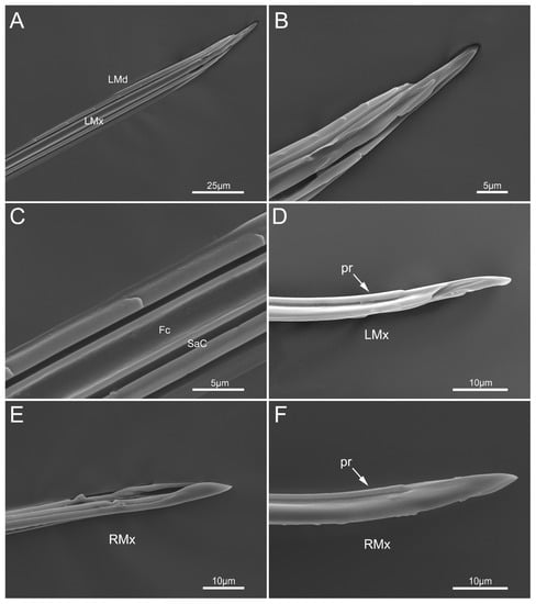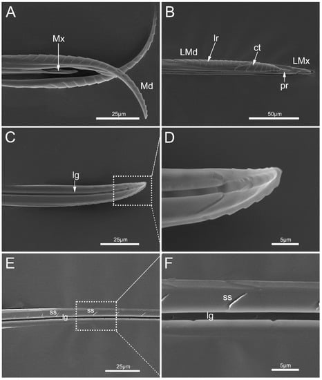 The left mandibular stylet (LMd) and right mandibular stylet (RMd) are concave, internally forming a groove to enclose the maxillary stylets. Eight to ten central teeth (ct) are ridge-like and are present on the external surface of the mandibular stylet at the apex along with a row of lateral ridges (lr) (Figure 7B). The inner surface of the mandibular stylet is relatively smoother, with a deep longitudinal groove (lg) on it (Figure 7C,E,F). Some small spikes (ss) are longitudinally arranged on the middle of the inner surface (Figure 7E,F).