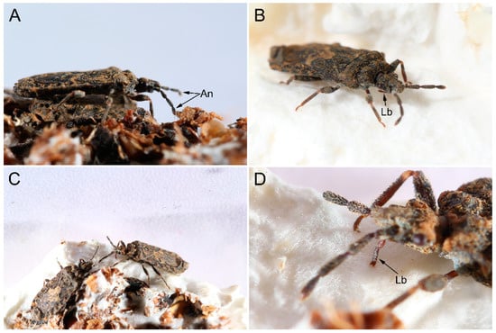 - Usinger, R.L. Studies in the american Aradidae with descriptions of new species. Ann. Entomol. Soc. Amer. 1936, 29, 490–516. [Google Scholar] [CrossRef]