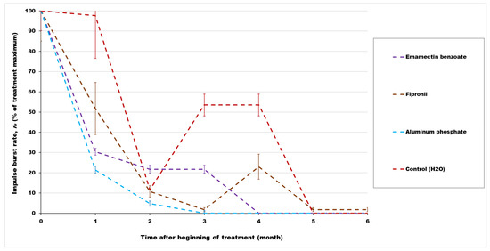The experiments were carried out in a completely randomized block design. For statistical comparisons, the rates of impulse bursts, rs, were compared with analysis of variance using SAS and the means were separated using Tukey’s test at p < 0.05 [40]. Although the experimental palms were known to be infested due to the presence of visual symptoms, the initial numbers and ages of RPW adults and larvae in each palm were unknown, and previous studies have indicated these strongly affect the mean impulse burst rate [20,26,29]. Consequently, the mean magnitude of rs in a particular treatment serves primarily as an indicator of the likelihood of continued infestation after treatment. Magnitudes of rs > 0.02/s indicate a medium or high likelihood of the presence of infestation [38]. Each tree would be considered to have an initially unknown level of infestation and might be infested by additional RPW after treatment. Successful treatment would require that the treatment provide residual control over the 6-month period of monitoring so that the measured rates of RPW impulse bursts would decrease to and remain at low likelihood of infestation.