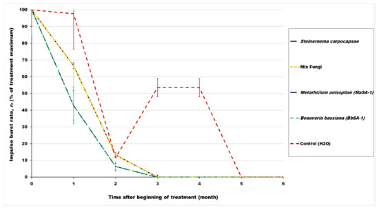 Mean impulse burst rates within RPW-infested date palm trees in each biological control treatment as a percentage of the maximum of all means for that treatment on a time scale beginning at the time of treatment (0) and then at specified months thereafter. Bars indicate the standard error of the mean percentage in each biological control treatment or distilled water control during the specified month.
