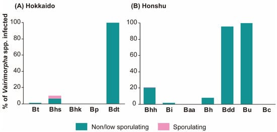 Prevalence of Vairimorpha spp. in different bumblebee species. Species names as abbreviations: Bt, B. terrestris; Bhs, B. hypocrita sapporoensis; Bhk, B. hypnorum koropokkrus; Bp, B. pseudobaicalensis; Bdt, B. diversus tersatus; Bhh, B. hypocrita hypocrita; Bi, B. ignitus; Baa, B. ardens ardens; Bh, B. honshuensis; Bdd, B. diversus diversus; Bu, B. ussurensis; and Bc, B. consobrinus.