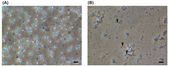 Images of Vairimorpha spp.-infected midgut homogenates of B. hypocrita hypocrita under a phase contrast microscopy (400×): (A) >five spores and (B) 1–4 spores. Arrowheads indicate microsporidian spores. Scale bar = 10 μm.