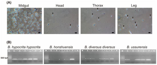 Organ specificity of Vairimorpha spp. (A) Images of the Vairimorpha spp.-infected organs of B. hypocrita hypocrita under a phase-contrast microscope (×400): midgut, head, thorax, and leg. Arrowheads indicate microsporidian spores. Scale bar = 10 μm. (B) PCR detection of Vairimorpha spp. in wild species: B. hypocrita hypocrita, B. honshuensis, B. diversus diversus, and B. ussurensis. M: DNA Ladder, G: midgut, O: ovary, H: head, T: thorax, L: leg, P: positive control, N: negative control. Asterisks indicate PCR-positive results.