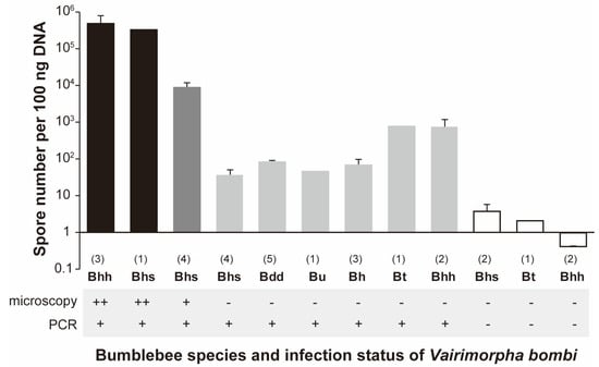 Spore numbers per 100 ng DNA as bar graph quantified using quantitative PCR in each bumblebee species and their Vairimorpha spp. infection statuses. Black bar indicates sporulating Vairimorpha spp. PCR-positive bumblebees (with more than five spores in a visual field); dark gray bar, sporulating Vairimorpha spp. PCR-positive bumblebees (with less than five spores in visual field); light gray bar, non/low-sporulating Vairimorpha spp. PCR-positive bumblebees; white bar, Vairimorpha spp. PCR-negative bumblebees. Species names as abbreviations: Bhh, B. hypocrita hypocrita; Bhs, B. hypocrita sapporoensis; Bt, B. terrestris; Bdd, B. diversus diversus; Bu, B. ussurensis; and Bh, B. honshuensis. The number of samples is indicated in brankets. Error bars represent standard errors.