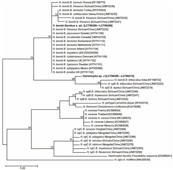 While V. bombi has been reported across a wide range of the Northern Hemisphere [3,11,15,56], other Vairimorpha (Nosema) spp. found in bumblebees have been reported in Asian regions—four species from China and two from Russia [16,17]—indicating a high diversity of microsporidia in bumblebees in Asia. Bumblebees also show high species diversity in Asia, and their geographic origin is considered to be the mountainous region of Asia [57,58]. Based on these facts, the microsporidia of bumblebees may have originated in Asia and then dispersed to Europe and North America as bumblebees expanded their habitats. Specifically, this is a possible explanation for the worldwide occurrence of V. bombi.