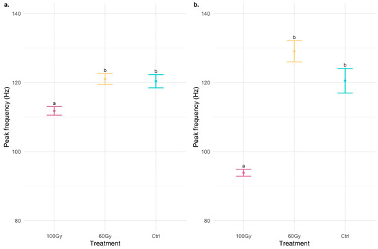 Dot plots with error bars of the peak frequency (Hz) of signals emitted during (a) the mount phase and (b) the mating. The dot represents the mean of peak frequency, and the error bar represents the standard error of the mean. The treatments indicated with different letters show significant differences (Kruskal–Wallis test at p < 0.001).