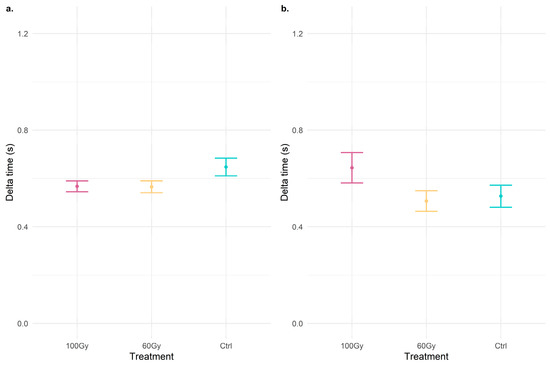 Dot plots with error bars of the delta time (s) of signals emitted during (a) the mounting phase and (b) mating. The dot represents the mean of delta time, and the error bar represents the standard error of the mean.