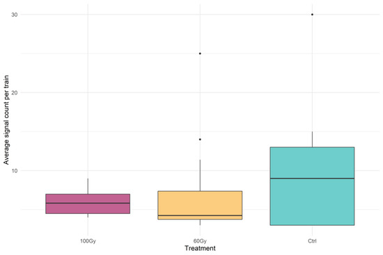 Box plots of the average signal count per train for each treatment. The box plots represent the interquartile range, with a horizontal bar being the median. The bottom whisker and the upper whisker represent the minimum and maximum values, respectively. The dots show the outliers.