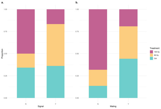 One hundred percent stacked column chart of the effect of different radiation grades (a) on the occurrence of signals during the mount phase and (b) on mating success following mount phase for each treatment. “N” stands for No, and “Y” stands for Yes. Only the individuals that have reached the mount phase were considered for this analysis.
