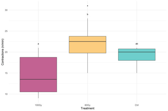 Box plot with the rate of contractions per minute that occurred during mating for each treatment. The treatments indicated with different letters show significant differences (one-way ANOVA at p < 0.01). The box plots represent the interquartile range, with a horizontal bar as the median. The bottom whisker and the upper whisker represent the minimum and maximum values, respectively. The dots show the outliers.
