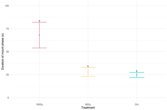 Dot plot with error bars of the time interval counting from the beginning of the mount phase to the beginning of mating. The treatments indicated with different letters show significant differences (Kruskal–Wallis test at p < 0.05). The dot represents the mean of delta time, and the error bar represents the standard error of the mean.