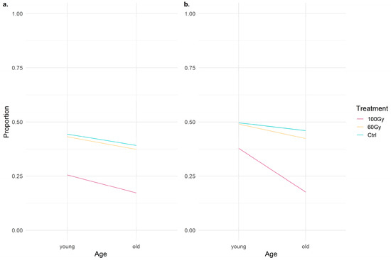 There were no problems detected in the residual diagnostics of the models. The significant factor of behavior 1′s GLMM was treatment 100 Gy (z = −3.222, p = 0.00127). The significant factors of behavior 2′s GLMM were treatment 100 Gy (z = −2.7747, p = 0.000888) and a young age (z = 1.642, p = 0.017961) (Table 1).