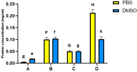 Protein concentrations in mg/mL for honey bee hemolymph extracted in PBS or DMSO where (A): bees from Port Said, (B): bees from Ismailia governorate, (C): bees from Suez governorate, (D): bees from Saint Catherine. Bars and error bars represent the mean values ±SE obtained from triplicate measurements. Different letters above bars indicate significant differences (Tukey’s test, p < 0.05): uppercase letters show comparisons across PBS dissolved samples; lowercase letters show comparisons across DMSO dissolved samples.