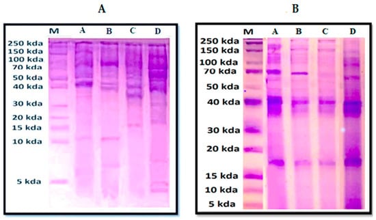 Photos of SDS-PAGE gels for honey bee hemolymph extracts dissolved in PBS (A) or DMSO (B) where (A): bees from Port Said, (B): bees from Ismailia governorate, (C): bees from Suez governorate, (D): bees from Saint Catherine. M: marker. The molecular weights of the proteins and their amounts are expressed by the color intensity of the protein bands.