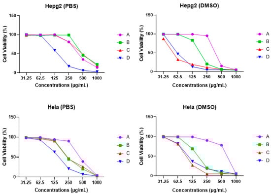 Effects of honey bee hemolymph extracts dissolved at different concentrations in PBS or DMSO on human cancer cell proliferation (HepG2 and HeLa), where (A): bees from Port Said, (B): bees from Ismailia governorate, (C): bees from Suez governorate, (D): bees from Saint Catherine.