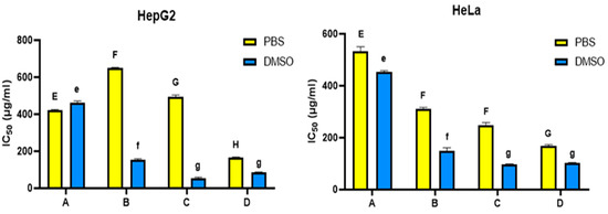 When considering extracts dissolved in PBS, the highest cytotoxic effect was recorded for hemolymph from site D (IC50 = 164.5 & 169.7 µg/mL against HepG2 and HeLa, respectively) and the lowest cytotoxic effect was observed in hemolymph from sites A and B (IC50 = 649.36 & 533.08 µg/mL against HepG2 and HeLa respectively) (Figure 4).