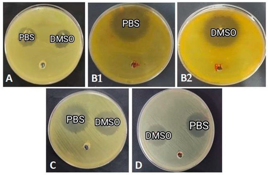 Antimicrobial activity of honey bee hemolymph extracted in PBS or DMSO against E. coli, where (A): bees from Port Said, (B1,B2): bees from Ismailia governorate, (C): bees from Suez governorate, (D): bees from Saint Catherine.