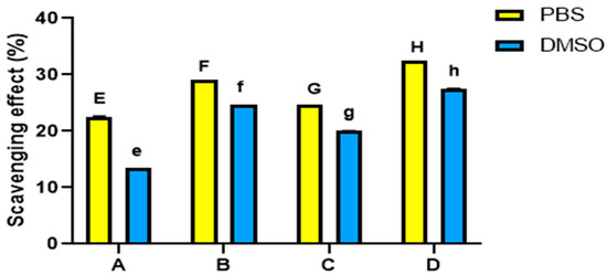 Considering PBS- and DMSO-dissolved extracts independently, there were significant differences between sites (p < 0.001). Extracts from site D consistently possessed the highest antioxidant activity in both solvents (p < 0.001), while extracts from site A possessed the lowest scavenging activity (Figure 6).