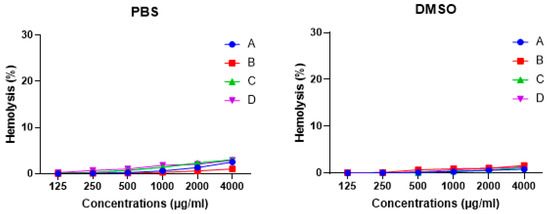 Hemolytic activity of honey bee hemolymph extracted in PBS or DMSO at different concentrations against erythrocytes where (A): bees from Port Said, (B): bees from Ismailia governorate, (C): bees from Suez governorate, (D): bees from Saint Catherine.
