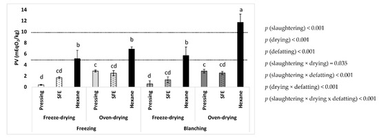 Initial oxidative state (PV) of the fat from BSFL processed by different methods of slaughtering, drying, and defatting. Dotted line means maximum reference values. Different letters between the treatments mean significant differences. Each data point corresponds to mean values ± SD, n = 4.