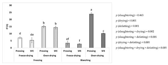 As shown in Figure 2, drying and defatting and different double and triple interactions significantly affected the induction time of oxidation (p > 0.05). However, in the case of slaughtering, a lack of effect of this independent factor was observed (p < 0.05). Thus, the oxidative stability of the fats under accelerated conditions remained the same, regardless of whether the samples were frozen or blanched. Concerning the drying process, freeze-drying resulted in samples with worse stability compared to oven-drying (4.6 and 15.9 h, respectively, as mean values regardless of the method of slaughtering and defatting). Therefore, this result is opposite to what was observed for the initial oxidative state of the samples, where the samples from freeze-drying showed the best initial values of oxidation compared to oven-drying (Figure 1). Concerning the method of defatting, those obtained through SFE were less stable than those obtained through mechanical pressing (8.2 and 12.3 h, respectively, as mean values regardless of the method of slaughtering and drying). Again, this result was not in agreement with the initial PV of samples, which showed the same initial value of oxidation for SFE and mechanical pressing (Figure 1). Regarding the interactions between the factors, all the two-factor and three-factor interactions were significant. Thus, the worst oxidative stability was found when the combination of blanching, freeze-drying, and SFE was performed (2.7 h), while the best stability was obtained when the samples were subjected to the combination of blanching, oven-drying, and mechanical pressing (23.9 h).