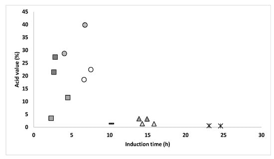 Correlation between induction time after Rancimat test (h) and acid value (%) of the fat from BSFL processed by different methods of slaughtering, drying, and defatting. Undotted circles (freezing, freeze-drying, mechanical pressing), dotted circles (freezing, freeze-drying, SFE), undotted triangles (freezing, oven-drying, mechanical pressing), dotted triangles (freezing, oven-drying, SFE), undotted squares (blanching, freeze-drying, mechanical pressing), dotted squares (blanching, freeze-drying, SFE), asterisks (blanching, oven-drying, mechanical pressing), line (blanching, oven-drying, SFE).