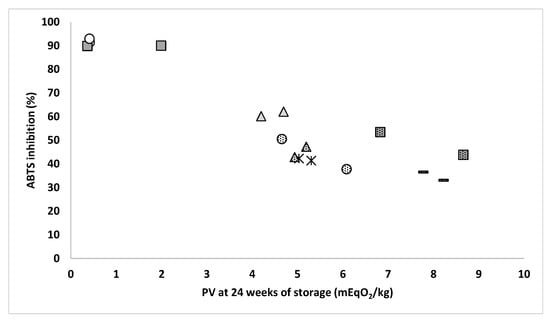 It can be hypothesized that the presence or absence of minor antioxidant and pro-oxidant compounds co-extracted during the processing of the larvae oil could be involved in the observed differences in the oxidative stability of fats during storage. In such case, due to the usual thermal lability of minor antioxidants compounds in oils, the impact of these molecules might not be evidenced under accelerated conditions of the Rancimat test, as frequently described for other oils [22,37], which could also explain the discrepancies with the assays of normal storage conditions. Therefore, to understand the likely presence of minor antioxidant compounds in the obtained fats of BSFL as affected by the different processing conditions, the antioxidant ability of the fat samples was determined using the method of ABTS radical scavenging assay of Re et al. (1999) [38]. As shown in Figure 5, a strong significant negative correlation was observed between the inhibition of the ABTS radical and the PV of the samples at 24 weeks of storage (r = −0.908, p < 0.001). Thus, those samples showing the highest antioxidant ability were the most stable concerning oxidation.