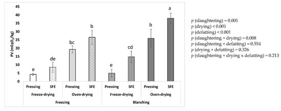 Initial oxidative state (PV) of the defatted meals from BSFL processed by different methods of slaughtering, drying, and defatting. Different letters between the treatments mean significant differences. Each data point corresponds to mean values ± SD, n = 4.