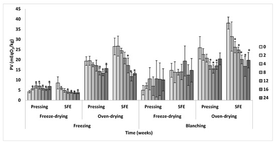 Oxidative stability (PV) during storage of the fat from BSFL processed by different methods of slaughtering, drying, and defatting. Samples with an asterisk within each treatment mean significant difference with respect to its respective initial value at week 0. Each data point corresponds to mean values ± SD, n = 4.