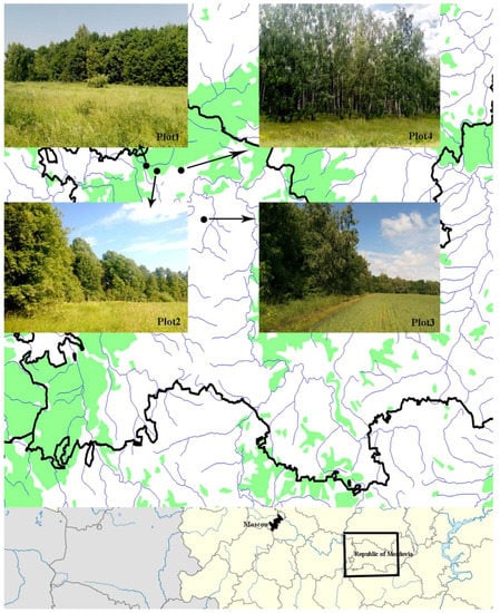 All studies were conducted in the Republic of Mordovia (the center of European Russia) (Figure 1) in 2020–2022. The region is located within the Volga Upland and the Oka-Don lowland. The studies were carried out in forest ecosystems located within the Oka-Don Plain—Lowland. The vegetation cover of the plain is mainly represented by forest communities and open spaces (meadows, agroecosystems, etc.).