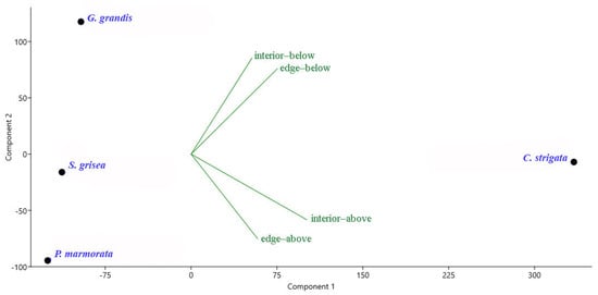 Principal component analysis (PCA) ordination diagram of some Coleoptera species based on their mean abundance at various heights of the bait trap positions (above—the height of 7.5 m, below—the height of 1.5 m) and the proximity of the forest edge (interior—inside the forest, edge—at the forest edge) in all four studied sites. Green represents bait trap positions, and purple represents four Coleoptera species. G. grandis—Glischrochilus grandis; S. grisea—Soronia grisea; P. marmorata—Protaetia marmorata; C. strigata—Cryptarcha strigata.