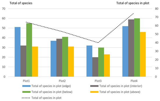 The general pattern was the greatest species diversity of Coleoptera on the edges in the lower traps. In plot1, it accounted for 64 species (Figure 3), of which 41 species (64.1%) were marked on the edge below (Table 1). In plot2, the species diversity of Coleoptera consisted of 53 species, of which 28 species (52.8%) were noted at the edge below. In plot3, the species diversity of Coleoptera included 40 species, of which 23 species (57.5%) were noted at the edge below. In plot4, the species diversity of Coleoptera numbered 75 species, of which 42 species (56.0%) were noted at the edge below.