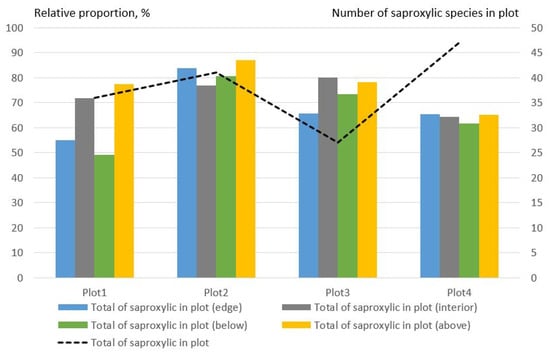 The proportion of saproxylic beetle species was very low in plot 1 at the edge of the lower trap. In other traps, the proportion of saproxylic species was higher than 60%. In plot4, the proportion of saproxylic species in all traps was approximately the same (Figure 4). The number of saproxylic species varied in different plots. However, according to the average data from all plots, the number of saproxylic Coleoptera species prevails in the forest interior, and the largest number of saproxylic was found in the upper traps.