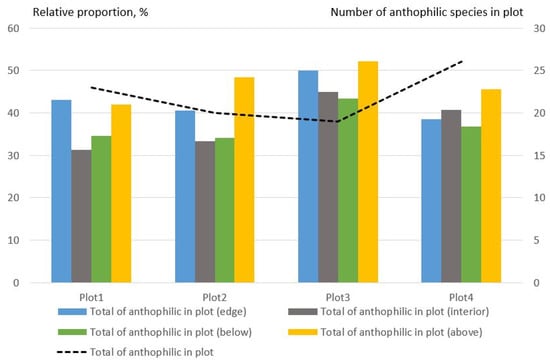 The number of anthophilic species in all traps was significantly lower than the number of saproxylic species. Their share varied in the different plots. However, on average, the number of anthophilic species on the edges was greater. All plots had a large proportion of anthophilic species at the edge in the upper traps (Figure 5).