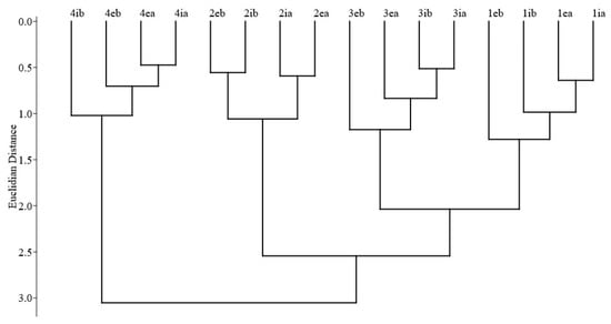 The similarity of the beetle species composition among all sampling variants (four sites, two height levels, and two positions regarding the proximity of the forest edge) based on the Jaccard index. We applied Ward’s method and the Euclidean distance (cophenetic correlation coefficient = 0.771). 1—plot1; 2—plot2; 3—plot3; 4—plot4; “i”—forest interior; “e”—edge of the forest; “a”—at the top height (7.5 m), “b”—at the lowest height (1.5 m).