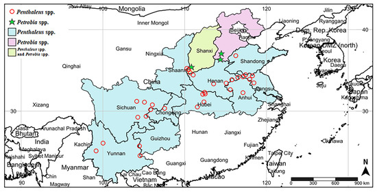 Two genera of mites were found in the main winter wheat regions of China during this survey, including Penthaleus spp. and Petrobia spp. (Figure 1). The study found that Penthaleus spp. were the main pest mites in winter wheat regions and were distributed in 11 provinces and a municipality, including Yunnan, Sichuan, Guizhou, Shaanxi, Hubei, Shanxi, Henan, Anhui, Shandong, Jiangsu, and Chongqing. The range of Petrobia spp. was small, primarily in Shanxi and Hebei. Moreover, the map revealed that both Penthaleus spp. and Petrobia spp. occurred in Shanxi Province. Penthaleus spp. was the most widely distributed; however, it was not found in Hebei. Among the 35 survey sites, Penthaleus spp. was found in 32 sites, accounting for up to 91.43%, while Petrobia spp. was only found in three sites. The population distribution range and number were significantly lower than Penthaleus spp.