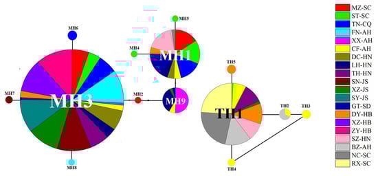 Location map of the studied wheat populations of P. major and P. tectus in Southwestern China (SW), Middle and Lower Yangtze Valleys (YV), and Yellow and Huai Valleys (YH), which are the three major winter wheat areas of China. The picture was created using the online website SimpleMappr (https://www.simplemappr.net accessed on 16 December 2022) with latitude and longitude data. The haplotype network diagram was created in PowerPoint.
