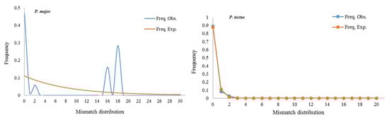 Mismatch distribution analysis of P. major and P. tectus from 23 locations based on COI gene.
