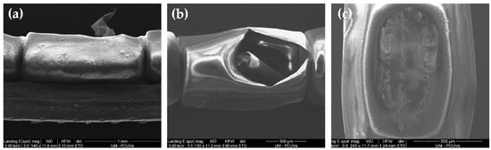 Scanning electron micrographs of both the hemicylindrical eggs, which are laid in long chains, end to end, along the needles of the host tree [24], and the egg glue are presented in Figure 1. Figure 1a shows an intact egg, while Figure 1b shows a hatched egg. Figure 1c shows the egg glue.