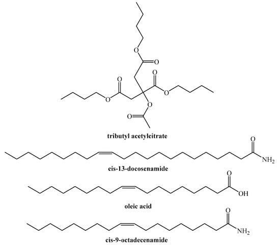 Regarding the known functions of the chemical species identified by GC−MS (Tables S1 and S2), several of them are plasticizers. Tributyl citrate and tributyl acetylcitrate are hydrophobic plasticizers and lacquer-forming agents [31]. 1-Propene-1,2,3-tricarboxylic acid tributyl ester (tributyl aconitate) is a hydrolysis product of tributyl acetylcitrate [32], while dibutyl itaconate is used for making plasticizers, adhesives, lubricants, and gelation accelerators [33]. They all exhibit high plasticization efficiency, excellent intermiscibility, outstanding light, water, and cold resistance, low volatility, great ductility, strong weatherability, and good biodegradability. On the other hand, other organic compounds identified in L. occidentalis eggs and egg glue have been previously identified as semiochemicals. High levels of cis-13-docosenamide (an elastomer resin) were found on the surface of females of the lone star tick, Amblyomma americanum L. [34]. Hexadecanoic acid methyl ester is known to be attractive to female moths of Ostrinia furnacalis Guenée, 1854 [35], while oleic acid, the second most abundant fatty acid in pine nut oil, is a necromone across arthropod taxa [36]. Additionally, cis-9-octadecenamide has been reported to be an oviposition stimulant and attractive to female moths of O. furnacalis [35]. Concerning palmitic, oleic, and linoleic acids, they have been previously reported in extracts of egg clusters of T. podisi [3].