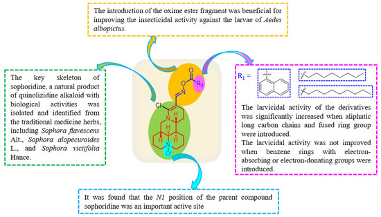 The SAR analysis results of these novel sophoridine derivatives are summarized in Figure 4. First, the insecticidal activity against the larvae of Ae. albopictus significantly increased when the oxime ester fragment was introduced at the C14 position of sophoridine, whereas the parent compound showed low insecticidal activity. Second, a series of side-chain structures was introduced by esterification at the hydroxyl group of the oxime ester. Anti-mosquito activity did not improve when the side-chain groups were benzene-ring structures with either electron-absorbing or electron-donating groups compared with the parent compound. However, the larvicidal activity of the derivatives significantly increased when aliphatic long carbon chains and fused-ring fragments were introduced. Third, it was found that the N1 position of the parent compound sophoridine was an important active site to the larvicidal activity.
